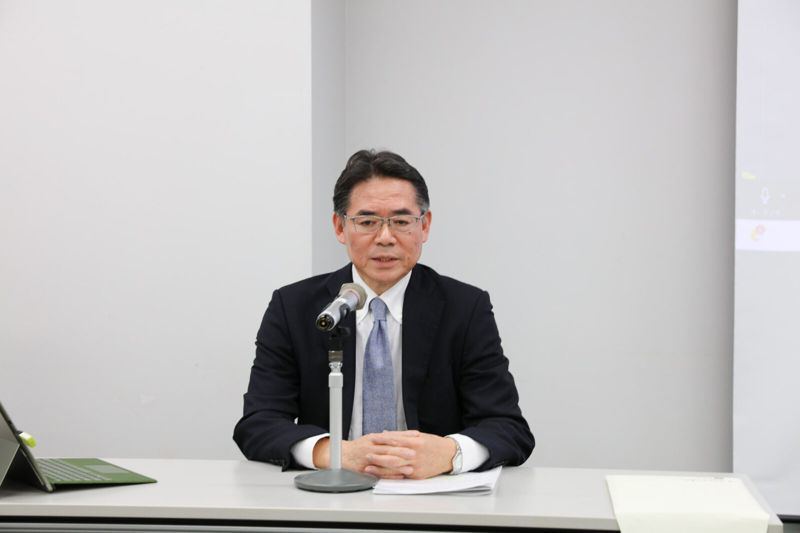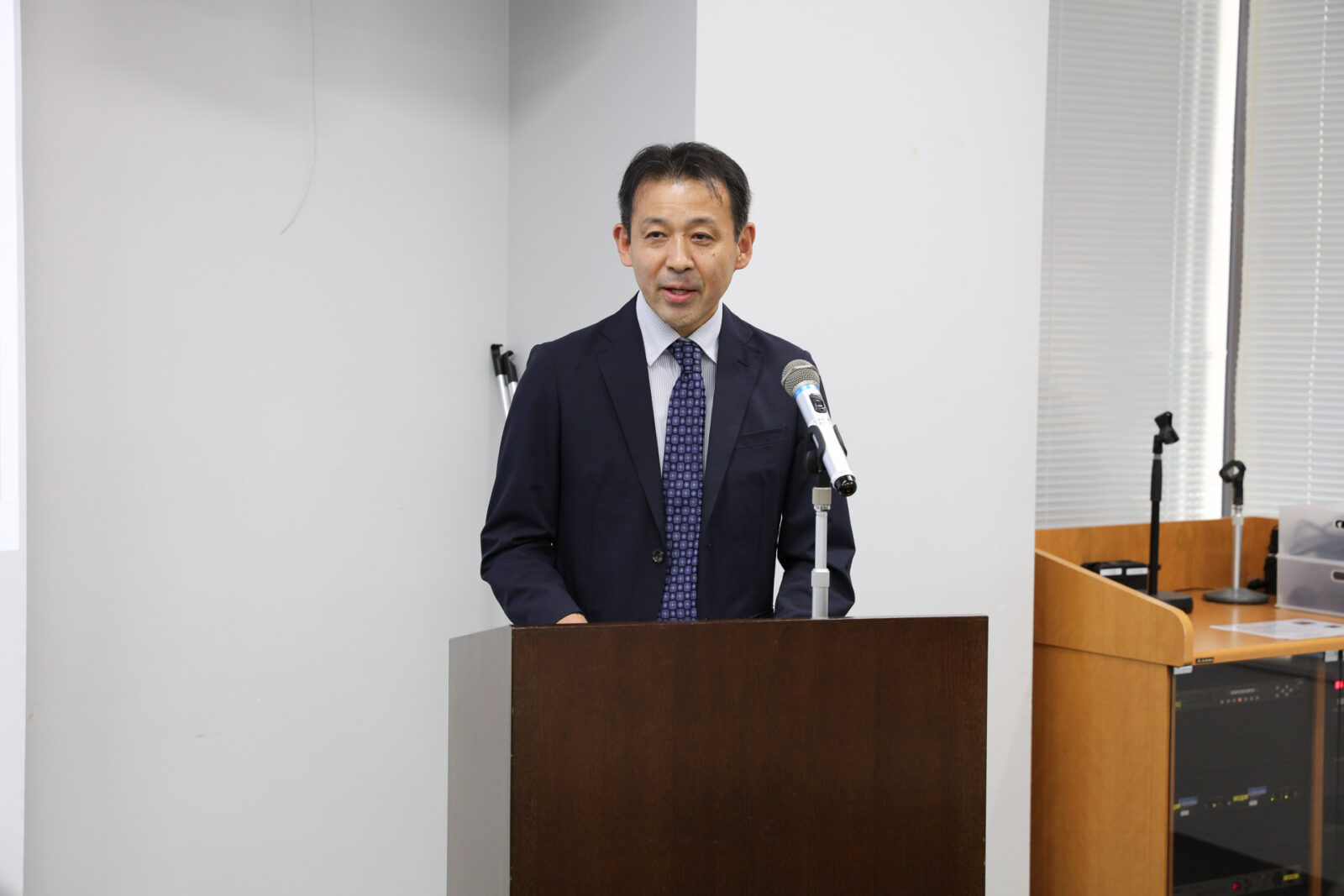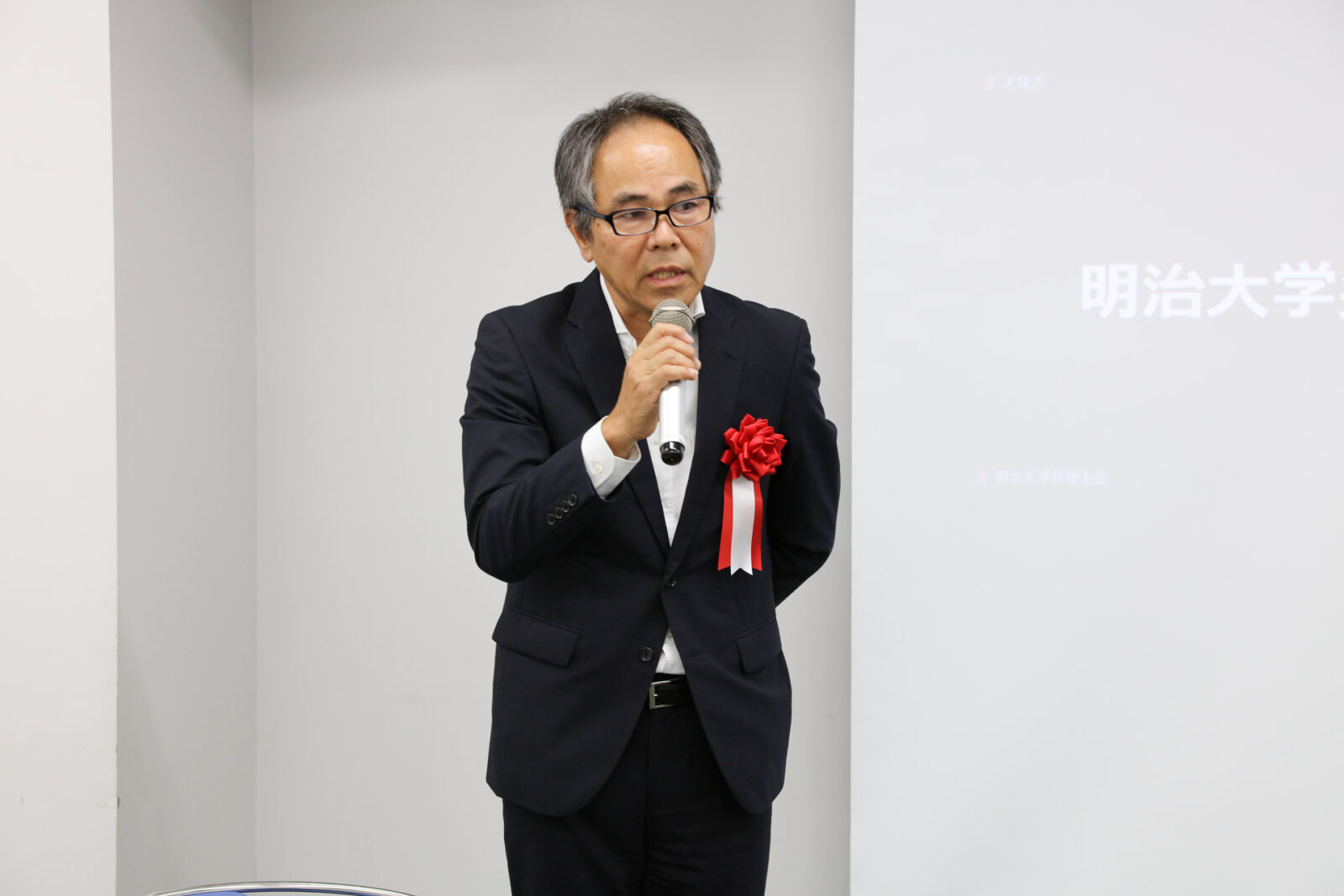 水戸部 繁樹 会長(明治大学不動産鑑定士会)の開会の辞で始まり明治大学 法学部 学部長 長坂 純 様と明治大学 情報コミュニケーション学部 学部長 阿部 力也 様からご挨拶をいただきました。