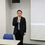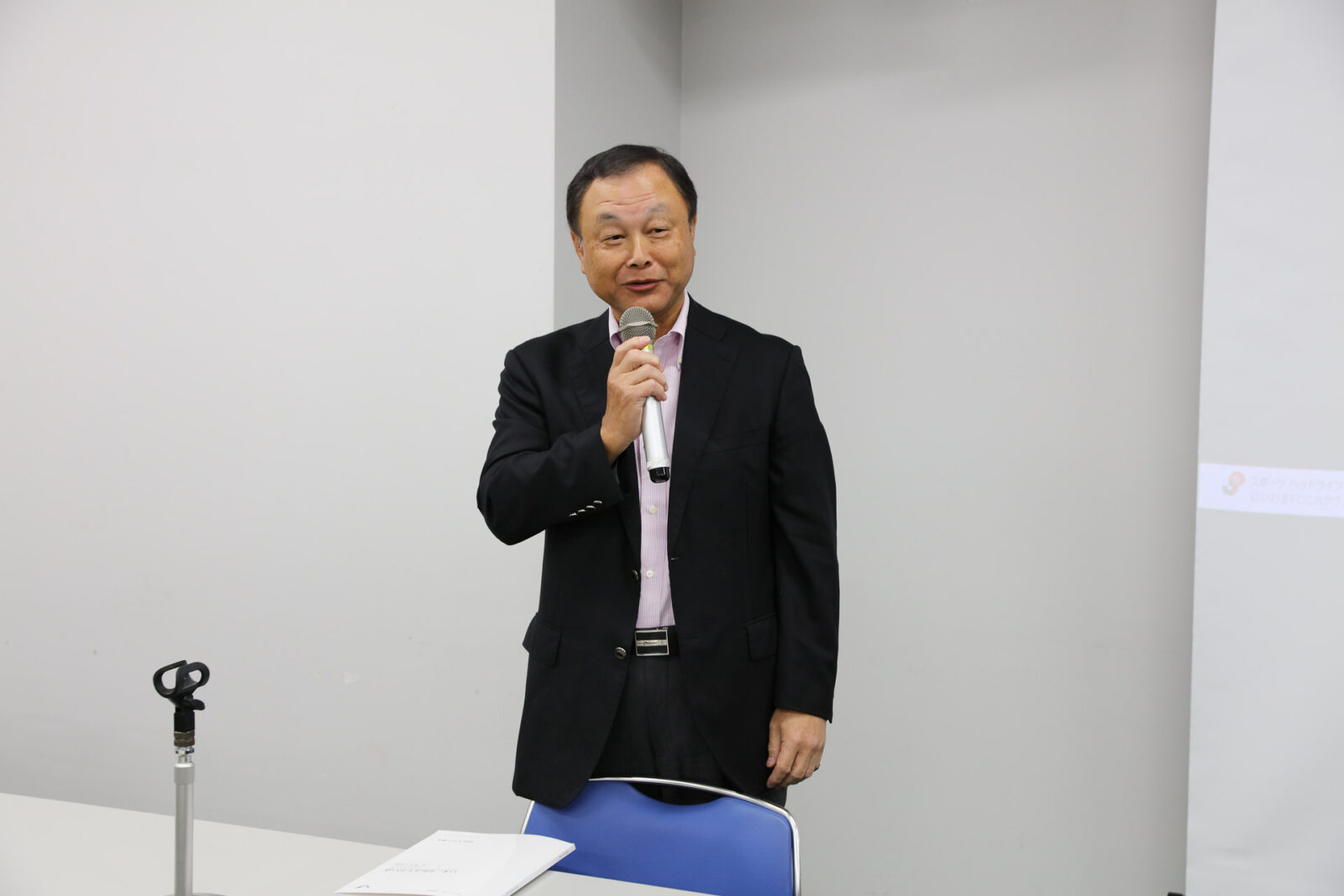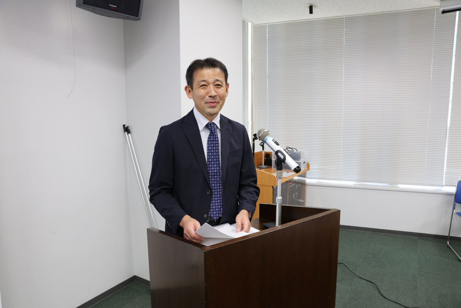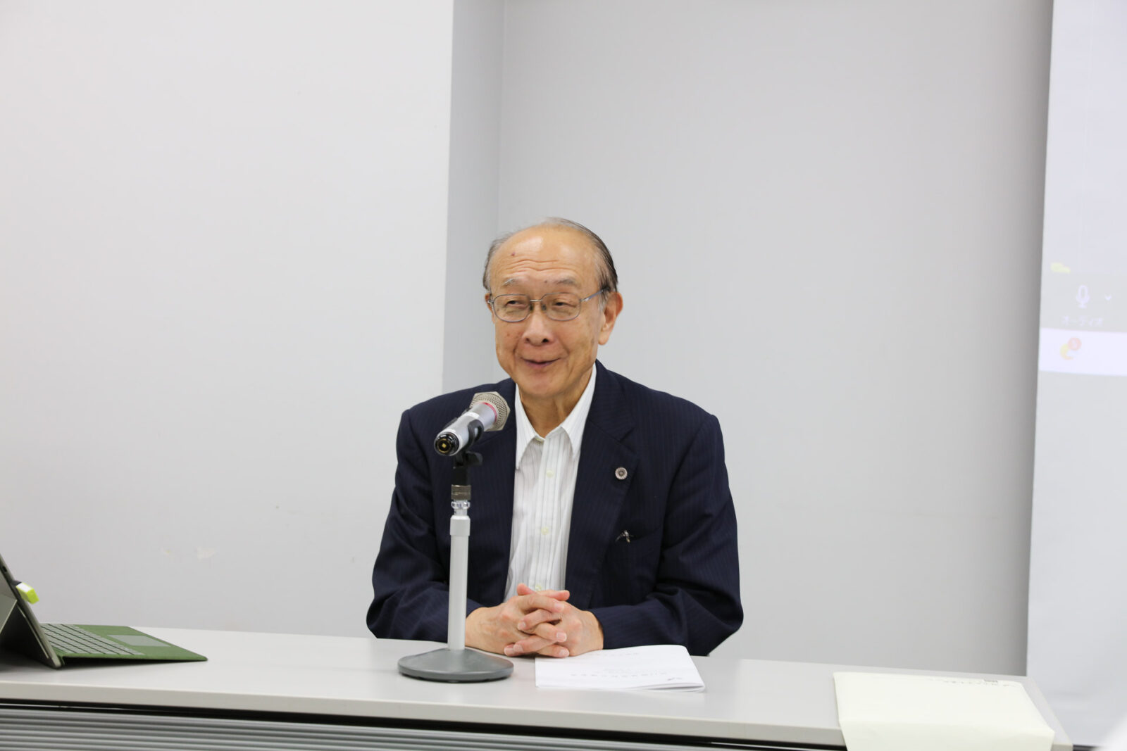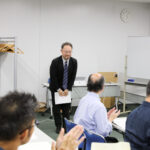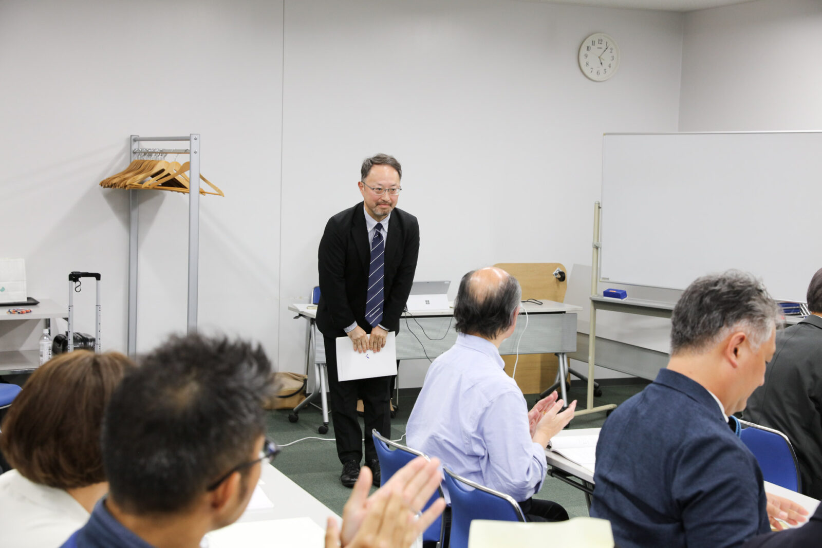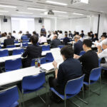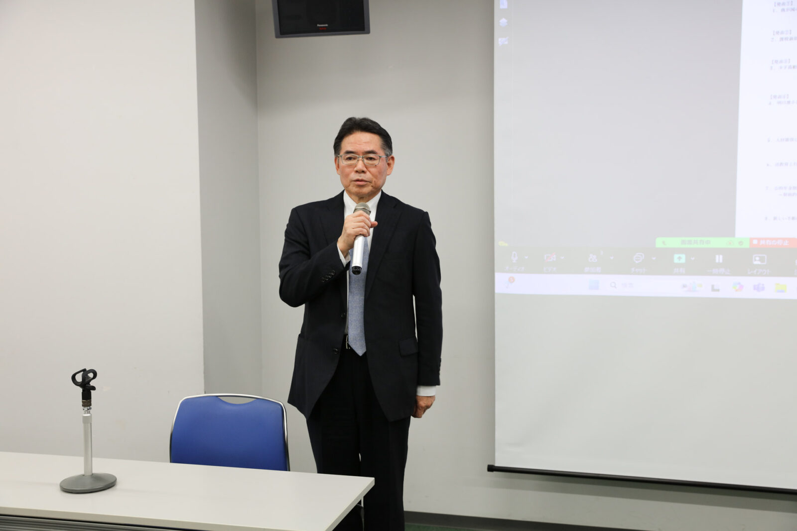 会長挨拶後、明治大学常勤理事 岸上 謙司 様よりご挨拶をいただき研修会を開始。